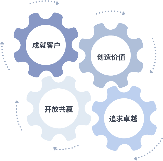 成就客户是一切决策的出发点,,创造价值是衡量所有工作的标准,,,,追求卓越是我们做事做人的态度,,开放共赢是我们的格局也是最终的结果。。价值观的齿轮环环相扣,,推动着组织里的每个人不断向前。。