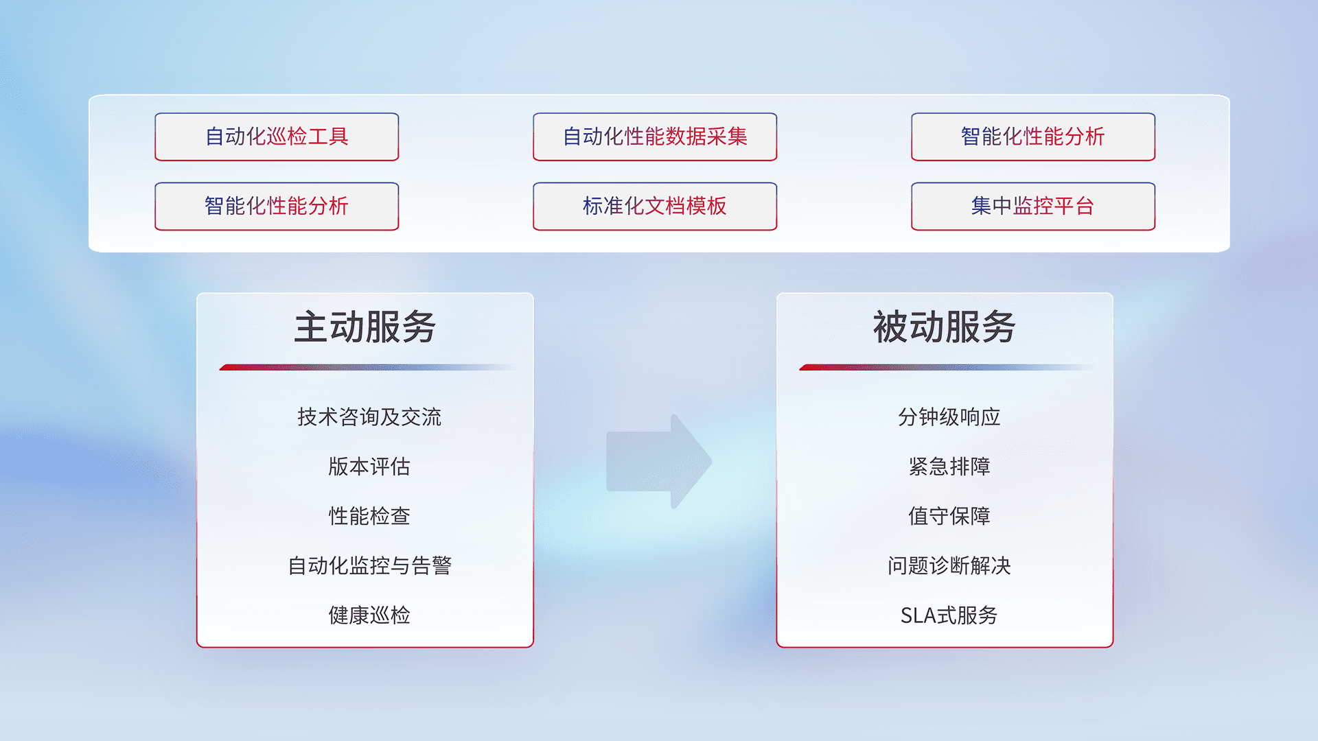 智能化工具和标准化文档,,,,保障服务质量,,,提供主动服务(包含技术咨询、、、版本评估、、性能检查、、自动化监控与告警、、健康巡检)和被动服务包含(分钟级响应、、、、紧急排障、、值守保障、、、、问题诊断解决、、、SLA服务)。。。。