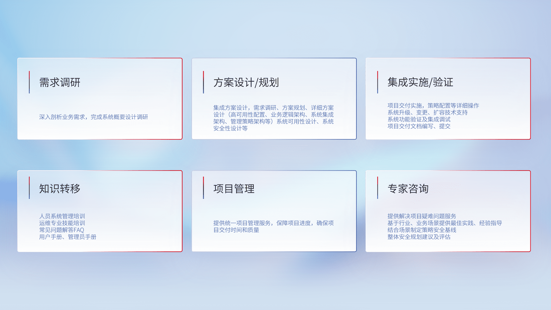 针对客户行业特性,,,,将宏观的安全战略和需求,,,通过专业的交付服务,,,实现项目落地,,,为客户提供标准规范的集成交付服务。。。。